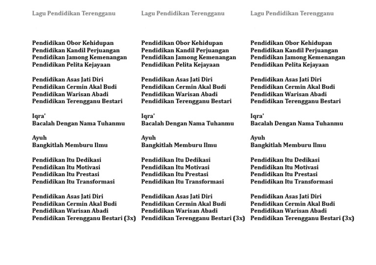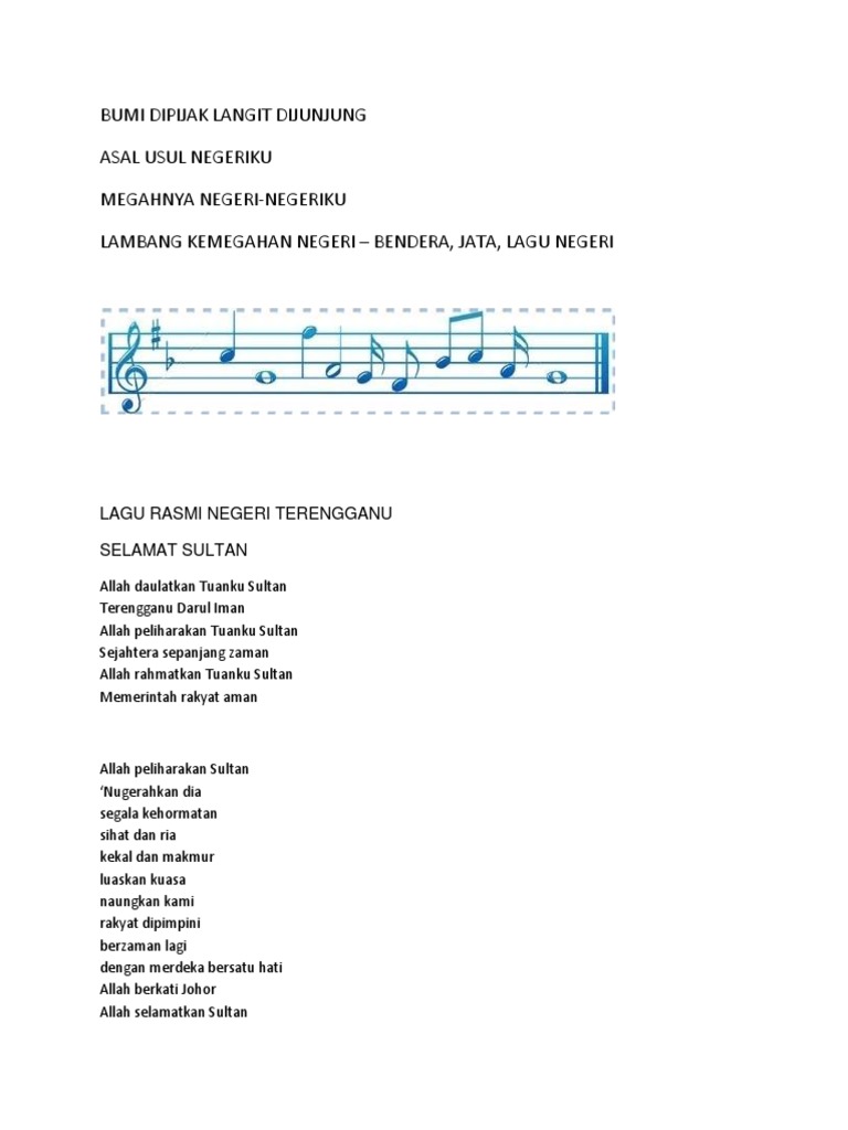 10 2 3 Bendera Lagu Dan Jata Sebagai Lambang Negeri Sejarah Tahun 6 from sejkssrt6t1u2.files.wordpress.com C g inilah negeri kita dm am f alamnya kelam tiada berbintang c e dari derita dan derita menderita. Chordify gives you the chords for any song. Pagesbusinesseseducationjabatan pendidikan negeri terengganuvideosjabatan pendidikan negeri terengganu. Dapatkan lirik lagu lain oleh marjinal di kapanlagi.com. Lagu negeri terengganu darul iman 'daulat sultan' youtube. Kumpulan lirik lagu penghiburan orang meninggal lirik lagu rohani kristen. Allah daulatkan tuanku sultan terengganu darul iman allah peliharakan tuanku sultan sejahtera sepanjang zaman allah rahmatkan tuanku sultan memerintah rakyat aman. Syalom artikel ini saya khususkan hanya untuk menampilkan lagu.