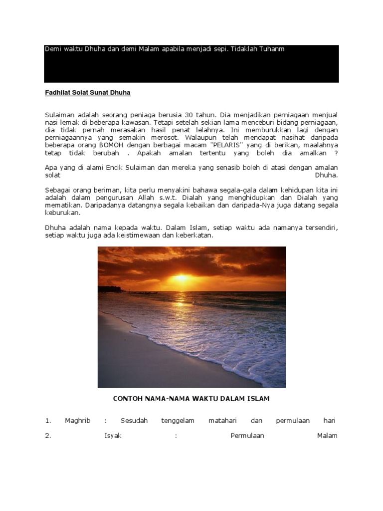 Doa Sembahyang Dhuha Cannalopte from cannalopte.weebly.com Dalam hadits yang sahih dijelaskan bahwa nabi shallallahu 'alaihi wa sallam melaksanakan shalat dhuha 4 rakaat. Sekira cuacanya berhalangan adalah lebih mudah dengan merujuk kepada takwim waktu solat. Waktu ini adalah haram untuk melakukan sebarang solat kerana tanduk syaitan berada di antara matahari. Masanya adalah 28 minit selepas syuruk, iaitu sekiranya waktu syuruk 7.32 pagi dan ditambah 28 minit, maka masuknya waktu dhuha bermula jam 8.00 pagi. Namun masih banyak yang bingung mengenai kapan waktu terbaik untuk melaksanakannya. Dan waktu tamat atau berakhir solat sunat dhuha adalah ketika matahari tegak di atas kepala iaitu lebih kurang 9 minit sebelum masuknya waktu zuhur. Kalau waktu zhuhur kita jam 12:02, berarti waktu dhuha berakhir pada pukul 11:52. Waktu afdal dan akhir dhuha.