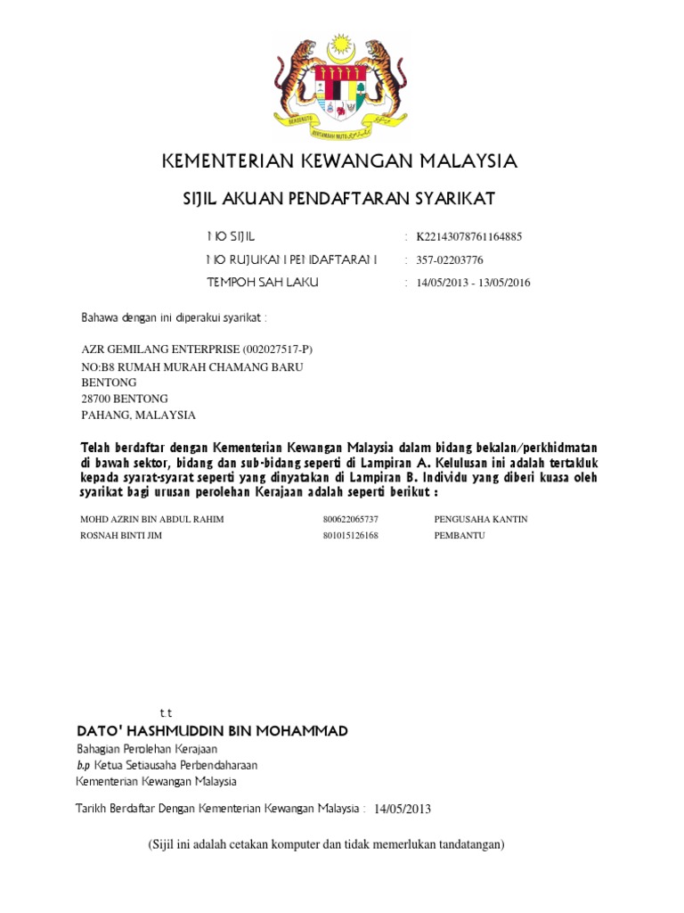 Kelulusan ini adalah tertakluk kepada. Kami bertanggungjawap untuk pastikan urusan pembaharuan syarikat anda dengan kementerian kewangan malaysia berjalan lancar dengan pengalaman yang ada, kami agak pakar dengan setiap syarat & prosedur permohonan pembaharuan syarikat dengan kementerian kewangan malaysia. Kementerian kewangan malaysia, kuala lumpur, malaysia. Pelajar boleh menyemak keputusan stam secara dalam talian atau melalui sistem khidmat pesanan ringkas (sms). Sijil ertinya sijil kemahiran malaysia (skm), diploma kemahiran malaysia (dkm), diploma lanjutan kemahiran malaysia (dlkm) dan penyata pencapaian (pc) yang dianugerahkan kepada mereka yang layak di dalam sistem persijilan kemahiran malaysia oleh ketua pengarah